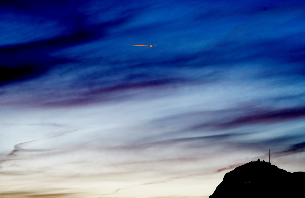 Als erstes hat uns der Komet damit geärgert, dass er sehr plötzlich aufgetreten ist. Damit will ich sagen, dass alle noch dem Kometen des letzten Jahres nachtrauerten, der im Frühjahr richtig schön zu sehen sein sollte. Aber der dann in einzelne kleine Stücke zerbrochen ist, die natürlich nicht mehr gut zu beobachten waren. Dann kommt er, Neowise, aber nicht am Abend, sondern am sehr frühen Morgen. Man musste schon Frühaufsteher sein, um ihn um 3:00 Uhr in der Nacht zu beobachten. Ich war es nicht, -Frühaufsteher-... Ab Anfang Juli wurde der Komet auch am Abend sichtbar, doch man musste schon bis zur Dunkelheit gegen ca. 22:30 Uhr (besser noch 23:00 Uhr) warten, um ihn dann am nordwestlichen Horizont erblicken zu können. Doch bei mir zu Hause steht im Norden der Wendelstein und der zieht sich mit den umliegenden Bergen ( Breitenstein etc. ) bis zum Nordwesten, fast Westen hin. Also mitten in der Nacht,... auf zum Sudelfeld. Dies habe ich dann auch am 13.07.2020 getan. Leider bei etwas wolkenverhangenem Himmel. Mit bloßen Auge konnte ich keinen Kometen sehen, deshalb einfach Fotos in Richtung Wendelstein, etwas links davon (leicht Richtung Westen) und das Resultat war das Folgende: (mit viel Software Nacharbeit) |