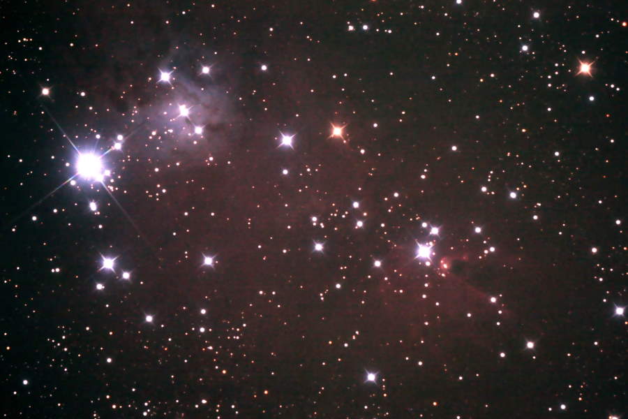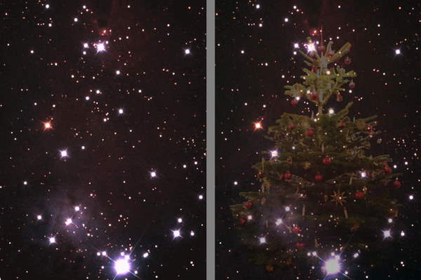 Dieser offene Sternhaufen passt zu Weihnachten, ist am Himmel zu dieser Zeit allerdings erst spät mit einem Teleskop zu beobachten. Er geht gegen 18 Uhr auf und passiert den Meridian (die Nord - Süd Linie am Himmel) erst nach Mitternacht.