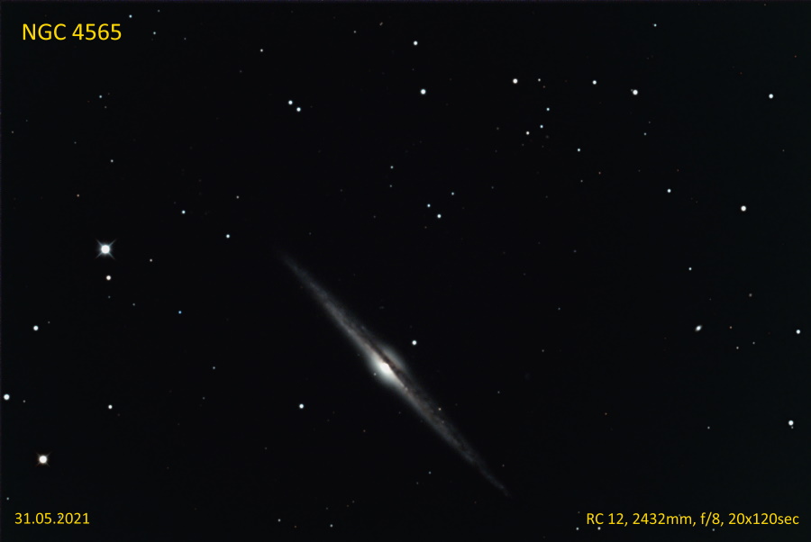 Im Sternbild Haar der Berenike, gleich östlich vom Sternbild Löwen ist diese Galaxie auch bei der visuellen Beobachtung durch ein Teleskop ein sehr schönes Objekt. Die Nadel Galaxie sieht tatsächlich im Teleskop wie eine spitze Nadel aus. Dies kommt daher, weil die Spiralgalaxie uns genau ihre Seite zeigt und damit der Staub in den Spiralarmen deutlich vor dem helleren inneren Kern hervortritt. |