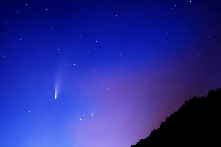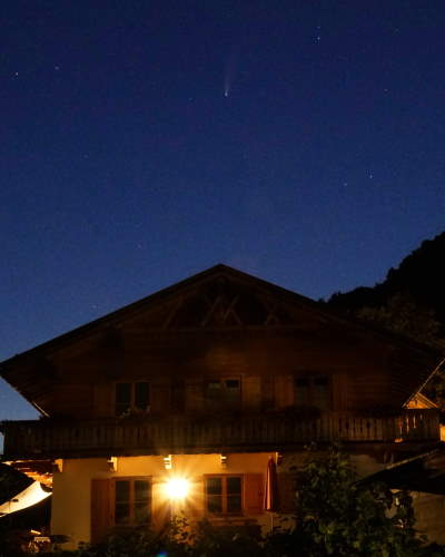 Als erstes hat uns der Komet damit geärgert, dass er sehr plötzlich aufgetreten ist. Damit will ich sagen, dass alle noch dem Kometen des letzten Jahres nachtrauerten, der im Frühjahr richtig schön zu sehen sein sollte. Aber der dann in einzelne kleine Stücke zerbrochen ist, die natürlich nicht mehr gut zu beobachten waren. Dann kommt er, Neowise, aber nicht am Abend, sondern am sehr frühen Morgen. Man musste schon Frühaufsteher sein, um ihn um 3:00 Uhr in der Nacht zu beobachten. Ich war es nicht, -Frühaufsteher-... Ab Anfang Juli wurde der Komet auch am Abend sichtbar, doch man musste schon bis zur Dunkelheit gegen ca. 22:30 Uhr (besser noch 23:00 Uhr) warten, um ihn dann am nordwestlichen Horizont erblicken zu können. Doch bei mir zu Hause steht im Norden der Wendelstein und der zieht sich mit den umliegenden Bergen ( Breitenstein etc. ) bis zum Nordwesten, fast Westen hin. Also mitten in der Nacht,... auf zum Sudelfeld. Dies habe ich dann auch am 13.07.2020 getan. Leider bei etwas wolkenverhangenem Himmel. Mit bloßen Auge konnte ich keinen Kometen sehen, deshalb einfach Fotos in Richtung Wendelstein, etwas links davon (leicht Richtung Westen) und das Resultat war das Folgende: (mit viel Software Nacharbeit) |
