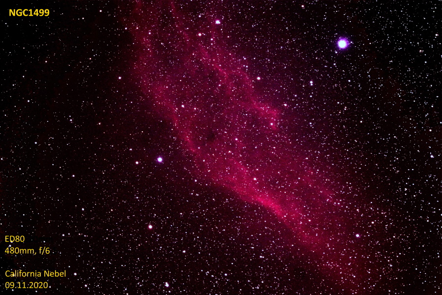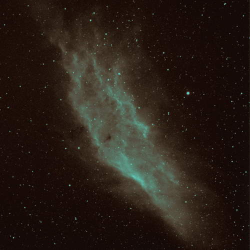 Dieser Gasnebel mit der Katalognummer NGC 1499 wird wegen seiner Form auch California Nebula (Kalifornien Nebel) genannt. Hier ein Bild, aufgenommen mit H-Alpha Filter(7nm); es werden etwas mehr Details sichtbar, allerdings nur im Bereich von 656nm (+/- 3,5nm) und das in "Falschfarben" sichtbar gemacht.